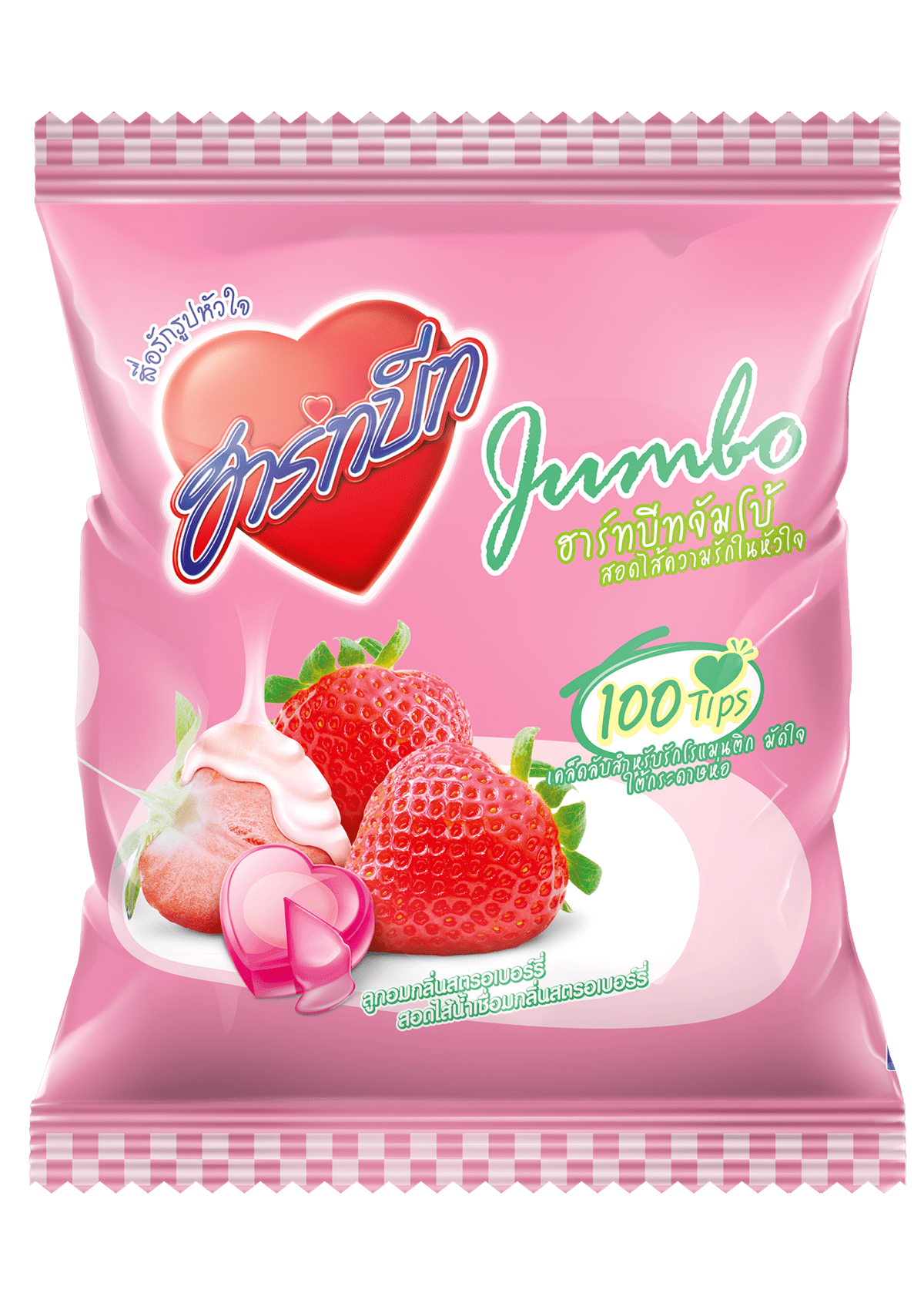 ลูกอมรูปหัวใจ เม็ดจัมโบ้กลิ่นสตรอเบอร์รี่ สอดไส้น้ำเชื่อมกลิ่นสตรอเบอร์รี่